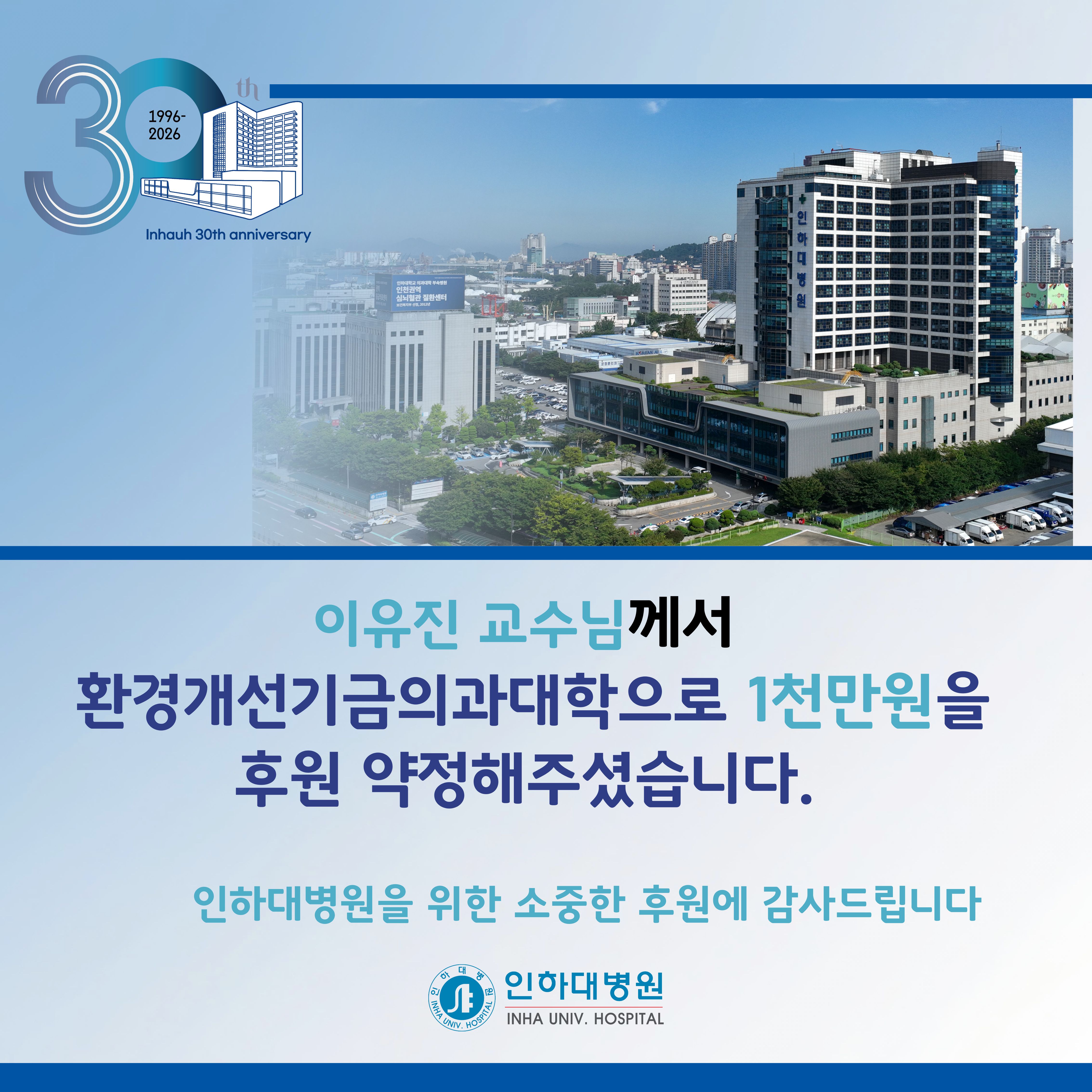 이유진 교수님의소중한 후원에 감사드리며, 항상 병원발전을 위해 노력하는 인하대병원이 되겠습니다.